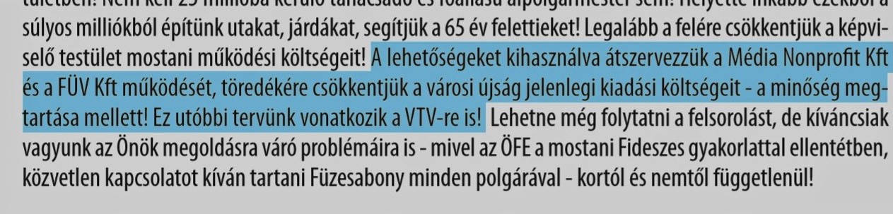 „A lehetőségeket kihasználva átszervezzük a Média Nonprofit Kft és a FÜV Kft működését, töredékére csökkentjük a városi újság jelenlegi kiadási költségeit – a minőség megtartása mellett! Ez utóbbi tervünk vonatkozik a VTV-re is!”