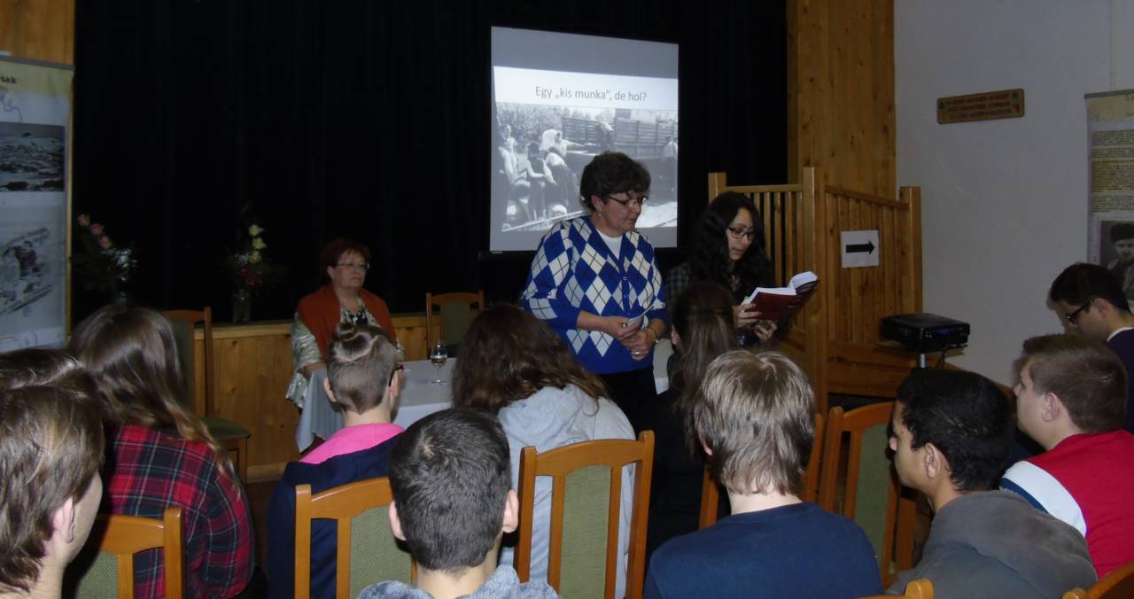 Az előadás után Majdán Ferencné „Három év három órában” című könyvének bemutatója következett. Egyetlen bűnük a nemzeti hovatartozásuk volt – ez a könyv mottója. Majdán Ferencné négy túlélőt kért arra, hogy meséljen arról, milyen emlékeket őriz 1945-ből, amikor a kompolti állomásról „málenkij robot”-ra hurcolták őket az akkori Szovjetunióba. A bemutató lebilincselő és egyben nagyon megható volt a jelenlévők számára.