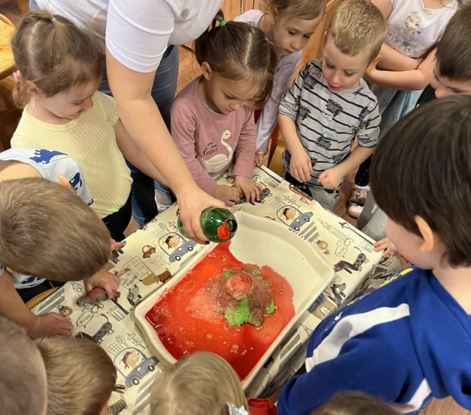 A hét egyik leglátványosabb momentuma a saját, működő vulkán megalkotása volt, amely nemcsak látványos „kitöréssel” lepte meg a csoportot, hanem igazi közös élménnyé is vált. Emellett mozgásos játékok, kézműves foglalkozások és kreatív alkotások színesítették a napokat: a gyerekek saját készítésű, vidám, színes dínókkal gazdagították a csoportszobát.