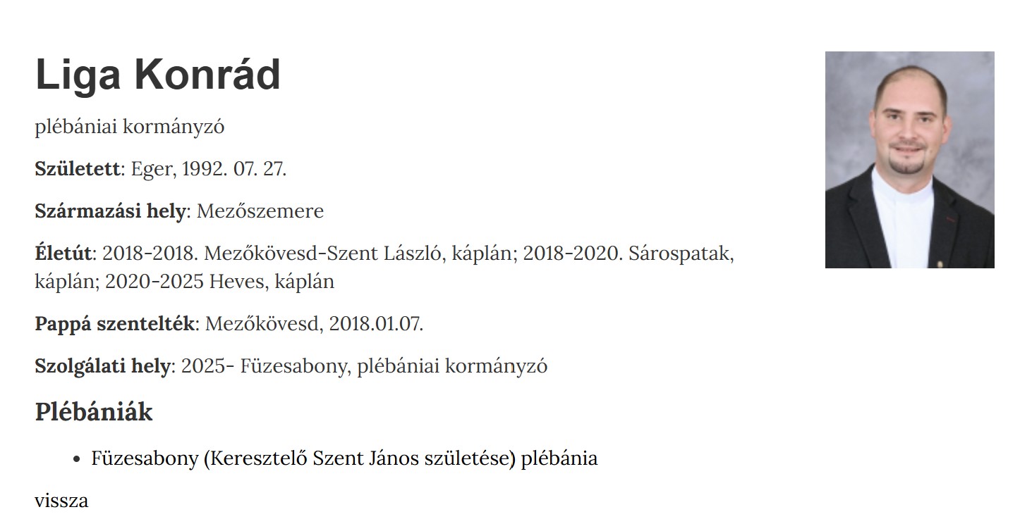 - 2020–2025: Heves, káplán